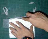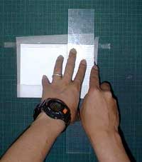それでは巻トレの上に台紙を裏返して置いて、ベロにする部分(裏にまわす部分)の長さ(30mm〜40mm)を考慮しつつ、おおよその位置でトレペをカッターで切ります。切って余ったトレペは捨てずに取っておきます。ブローニのポジなどにトレペかけする時に使えます。(取っておくための箱として、おかきやクッキーの缶などを必ず常備しておきましょう)