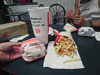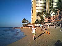 12.7(土)●調整日● 6時30分起床。7時をすぎて明るくなってからワイキキプリンスの横のヨットハーバー側から浜辺に出てワイキキを抜けカピオラニ公園までジョギング。さすがに明日がマラソンなのでそこら中にジョギングする人がいて異様な雰囲気。過去3回ハワイには来てるんですが、こんなワイキキは初めて見ました。ジョギング後シャワー浴びて朝食。ちなみにワイキキホブロンの泊まった部屋にはバスタブがあったが、お湯の溜められない仕様になっていました。(こんなホテルはじめてよ)よってシャワーのみです。この日の朝食は昨日フードパントリーで買ってきておいたパン、バナナ、チーズ、ハム、ウインナー、牛乳、グァバジュースに朝ABCで購入したグリーンサラダとパパイヤで1200kcal程度摂取。明日のために普段より多めに食っております。朝食後アラモアナビーチへ。午前中いっぱい積極的休養ってことで浜辺で昼寝。昼はえぞ菊セットでカーボローディング。できればセットは自慢の味噌にして欲しいですね。昼食後DFS4階でメールチェックと会社のパソコンが動いてるかチェック。30分4ドルでした。午後はワイキキを散歩後夕食の牛肉を買ってホテルに帰って早めに夕食をとり8時就寝。なにせ明日は朝5時スタートなので朝2時に起こされるわけです。就寝前にAVAから支給される明日の朝食(おにぎり2個・唐揚げ・バナナ・ウーロン茶)を取りに行く。 |