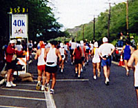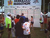 12.8(日)●大会当日● 早くベットに入ってはみたもののあまりよく寝れずに午前1時には目が覚めてしまい起床。支給の朝食を食べてさらに買っておいたバナナ2本を食べて、ウエストポーチにアミノバイタルゼリーを入れて、給水所以外でも好きなときに飲めるようにと日本から持参した高橋尚子+高木ブー仕様のヴァームウォータのペットボトルを腰に付け、寒さよけに100円ショップで買った雨ガッパをはおって3時30分にホテルを出発。歩いてアラモアナショッピングセンター前のスタート地点へ移動。大勢のランナーがすでに集まっている。5時に花火とともに、始めはたらたらとウォームアップをかねてジョギングでゆっくりスタート。15分後身体が温まってきたのでやや速度を上げる。最初の給水ポイントからしっかり給水するようにいわれていたのでアミノバイタルをがぶがぶ飲む。ワイキキを駆け抜けてダイヤモンドヘッド前の最初のトイレへ。ここでトイレが混んでいてややタイムロス。後で考えると最初のトイレは混んでいるので次まで我慢した方が得でしたね。まあこのときはタイムなんてどうでも良かったんで気にしてなかったんですけどね。一応最初の10kmを予定通り1時間以内で走り、真っ暗なダイヤモンドヘッドの上り坂を駈け抜けて下りに入ると明るくなってくる。カハラに入るところでまたトイレ。やっぱアミノバイタル飲み過ぎだったかも。でもすべての給水所ごとにアミノバイタルをがぶがぶ飲む。カハラを抜けて長いハイウェイに入る。ハーフを越えたあたりで永井大を抜いて、タイムが2時間ちょっとだったので後半多少頑張れば3時間台が出せるかもと記録に対する欲がここで出てくる。しかも天気は曇りがちで気温低く(スタート時摂氏22度)、暑いと思っていた熱帯の太陽がささず絶好のマラソン日和だ。ハイウェイが終わったところで3回目のトイレ。ちょっと速度を上げて行くと30kmで3時間を切っていたので、残り12kmをキロ5分の時速12kmペースでいけばいいわけです。その速度は普段トレッドミルで練習している1時間連続して走れる速度なんで、ここで疲れが出る前にアミノバイタルゼリーでカロリーを補給しとけばサブ4達成かと思ったんですが、やはり最後のダイヤモンドヘッドの登りが結構苦しく、残り12kmに1時間16分かかってしまったわけです。まあこの辺は歩いてしまってる人や、足がだめになっちゃった人とか結構いたので、後で思えば初フルでとりあえず歩かないで完走できただけでも良しとしましょう。正式タイムは4時間6分10秒でした。ゴールラインを越えるとゼッケンに赤マジックでチェックされ首に貝でできたネックレスをかけてもらいます。シャワーが有り頭からおもいっきり浴びてカピオラニ公園中央で完走Tシャツと完走メダルを受け取りAVAのテントへ。この段階で時刻はまだ9時をちょっと過ぎたところですが、ここでまたおにぎり2個と豚汁、冷やし白玉などの給食。あったかいコーヒーを飲んで休憩。ここで本来初マラソンを完走した喜びとか達成感がひしひしと来るはずなのだが、なぜか楽しみが終わってしまった感じの喪失感というか祭りの後って気分です。完走Tシャツを着て、アミノバイタルをもらって歩いてホテルへ。アイシング代わりにプールでひと泳ぎしてプールサイドで休憩。お昼に腹がへりABCでロコ弁当とサラダを買って食べる。マラソンはとにかく腹がへりますな。夜ご飯はまた巨大Tボーンステーキ。足中にトクホンを貼ったり、ビニル袋にいれた氷を膝にあてたりしつつ午後9時には寝てしまいました。なにしろ朝1時から起きてるわけで、かつマラソン走ってるわけですから相当な疲労なわけです。特に左足のももあげに使う内またの筋肉がまったく機能しないほどの疲労でした。寝ながらストレッチする。 以下私の公式記録内容です。 Results for 26,477 Official Finishers Fumiaki Kikuchi #18187 of Nerima-Ku JAPAN 10K: 00:58:39 Half Marathon: 02:00:09 30K: 02:50:06 Gun Time: 04:09:13 Finish Time: 04:06:10 Place Overall: 2927 by Gender: 2397 Men by Division: 328 (age 40) |