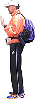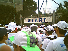 朝小雨がぱらつく中、前日受付を済ましてるんで別に早く行かなくても良かったんですが、早起き習慣おやじなため7時15分四谷中学に到着。まあ、大会2時間前の会場到着は鉄則だね。トロピカ〜ルさんに2003年代走会Tシャツを渡すため派手な格好で待つ。7時45分Tシャツ引き渡し完了。ついでに私が間違えて買った女性用競技用ランパンも持ってってもらう。別に履かんでも良いですよ。相当足出るからね。インターネットで知りあった人との初めての90秒程の接近遭遇でありました。 |