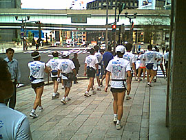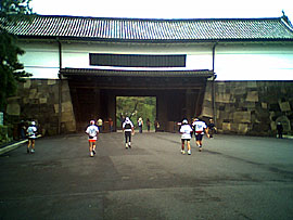 桜田門を抜けると最後のボスキャラ、三宅坂に遭遇。まさしくダイヤモンドヘッドの登りだな。ここは負けずに登ります。くうー、きついなあ。でもここで歩いてはいかんのだ。すべては2007年のための鍛練さ。走れ、はしれ。ゴールまであと2kmだ。それにしてもコース案内のボランティアの女性は美人ぞろいに見えるなあ。なんでだ? |