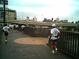 両国橋で隅田川を渡る。まだまだ元気。楽勝ですな。ただ集団は相当ばらけてきております。ただ、すでに走り始めて3時間を越えて、時間は12時をまわってますね。お昼かあ。 |