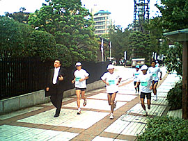 スピードをやや上げて都庁-代々木公園-表参道-青山-広尾-白金と走りあっという間に17km地点で東京タワーが見えてくる。前日受付を済ましている無意味にモチベーションの高い集団だけあって結構速いぞ。歩行者も突然現れた白装束の走る軍団に困惑気味。この後3万人も押し寄せて来ると誤解している。ふふふ、今日のところは2000人で許しといてやるぜ。 |