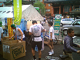 29km地点のかっぱ橋道具街の混雑に遭遇。道具街祭り開催中ですごい人出。歩道を歩いているとお互い迷惑って感じだな。ランナーの自己責任においてここは車道に出て進行しますよ。ただし走らずに歩きました。ここは歩いて進むルールですからね。しかしこの先30km地点のコース上3個目の歩道橋を上がっていると結構足に疲れが来ていることに気付く。夢舞いは思っているより過酷なのかも。 |