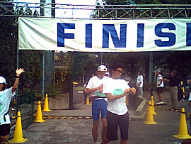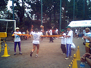 フィニッシュ後、もう1回ゴールが。ゴールテープは志保美悦子さんとスポーツライターでウルトラランナーの夜久さんが持っててくれました。ご苦労様です。ほのぼのとしたゴール風景ですなあ。とても迎賓館のとなりとは思えないね。 |