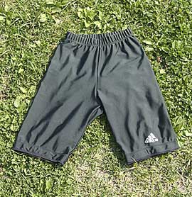 最初抵抗あったんですよ、こういうタイツ。なんか80年代のジャズダンスだったかエアロビックダンスブームのころ、リーボックの黒いシューズに今でいうルーズソックスのはしりみたいなレッグウォーマー、ヘアバンド、そしてこういうショートタイツで妙に明るい笑顔で体操みたいに踊ったりしてて、なんか他人事ながら恥ずかしいなあって思って見てたんですな。だから自分がジムに行くようになっても、ちょっとなあ、こいつはなぁ、男としてなあって思ってたんです。でも履いてみましたよ。そうしたら結構便利なんですね。水着代わりにもなりますからね。加圧効果っていうんでしょうか、適度に締付感があって大腿四頭筋とハムストリングに、なんかチカラ出る感じですよ。 |
