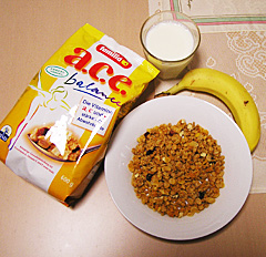 日本には炊きたてのご飯にみそ汁、焼き魚、卵、納豆、のり、漬物という、走る人にとって理想的な高炭水化物で低脂肪、ミネラル豊富な朝食メニューがあるわけですが、やはり調理に時間がかかるし、暑い夏には食欲もわかない。だったらシリアルはいかがか?って私はこういうシリアルの類いははっきり言ってお子様の食べ物と認識しており、腹持ちも悪いから本来眼中になかったんですが、スポーツ栄養ガイドブックという本の中でビタミン強化シリアルというのを薦めていたので試してみることにした。