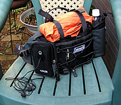 サイズの割に軽くできており、背中に当たる部分は衝撃吸収メッシュパッドになっています。左側の小さなポケットはオーディオコードが引っ張り出せるようになっていて、音楽を聴きながら走りたい人には良い設計でしょう。価格もアウトドアメーカ品としては低めであります。同じようなものが登山専門のモノになると結構高価であります。