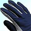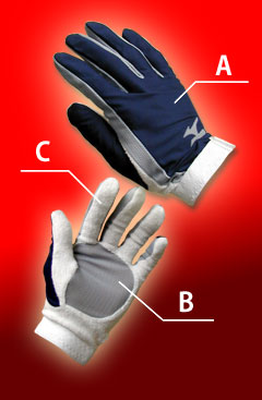 甲の部分はウィンドバリア(A部)という防犯用品かウイルス防止ソフトみたいな名前のテイジンの軽量な薄手のニット素材でできており、普通に手を握った状態だと防風効果が高いです。で、普通の手袋だと全体をひとつの布で作っちゃうものですが、ランニング用なんで手のひら側と指の横腹部分は旭化成のテクノファインメッシュ(B部)を使用して通気性を確保。さらに綿100%のパイル地(C部)を汗拭き用に指裏部分に使用。つまりただの手袋なのに要所要所に3種類の機能の違う素材を使っております。まさにアタックNo.1の八木沢三姉妹による三位一体攻撃みたいな立派な製品であります。