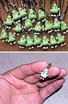 うちの奥さんが、粘土で小さなケーキのストラップを数年前くらいから作ってはヤフオクで販売していまして、ヨヨくんなら作れるというので試しに作ってもらったら、なかなかかわいいので、ついつい発注してつくってもらいました。 |